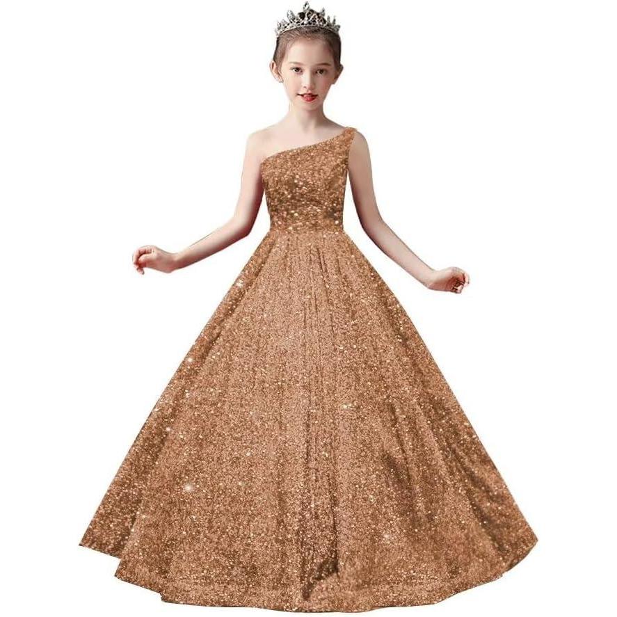 One Shoulder Sequin Pageant Gowns Sparkly Ball Gown Flower Girl Dresses for Wedding Princess Kids Toddler Dress(Brown)