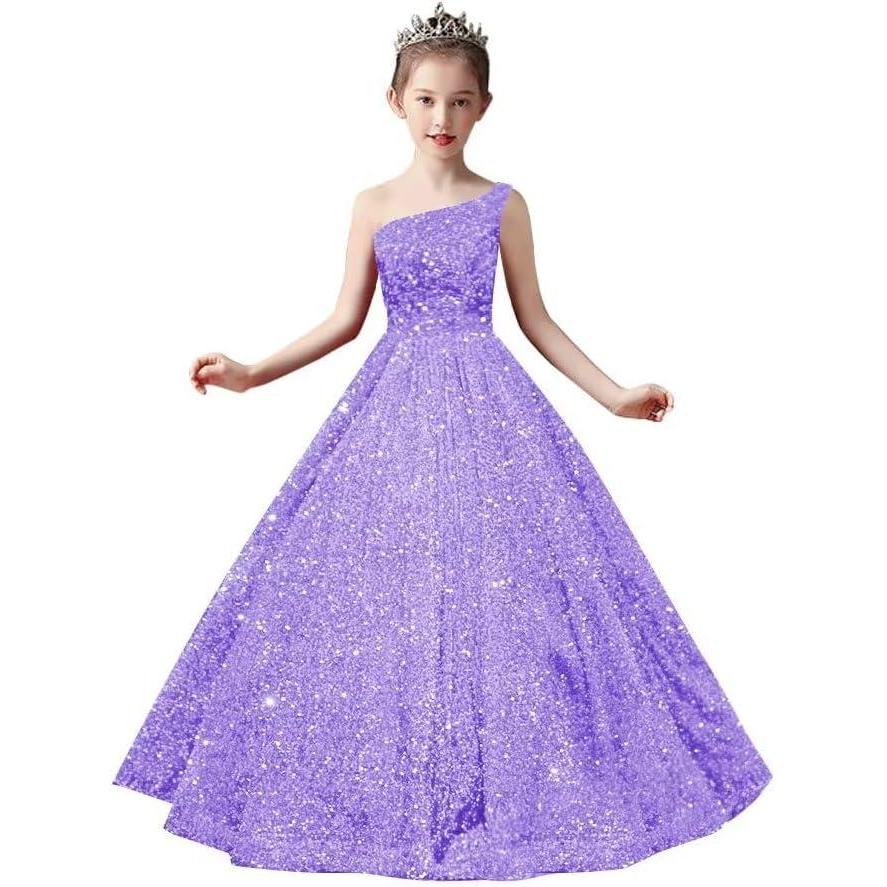 One Shoulder Sequin Pageant Gowns Sparkly Ball Gown Flower Girl Dresses for Wedding Princess Kids Toddler Dress(Lilac)