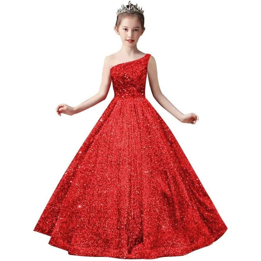 One Shoulder Sequin Pageant Gowns Sparkly Ball Gown Flower Girl Dresses for Wedding Princess Kids Toddler Dress(Red)