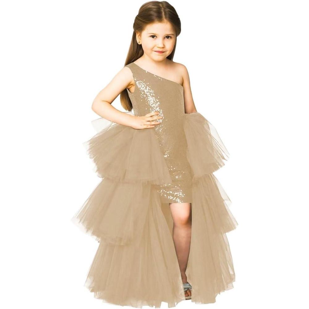 One Shoulder Sequin Pagent Dresses Girls Tulle Ball Gown Layered High Low Flower Girl Dress for Wedding(Champagne)