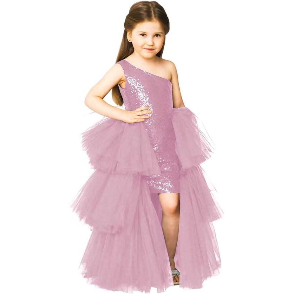 One Shoulder Sequin Pagent Dresses Girls Tulle Ball Gown Layered High Low Flower Girl Dress for Wedding(Dusty Pink)