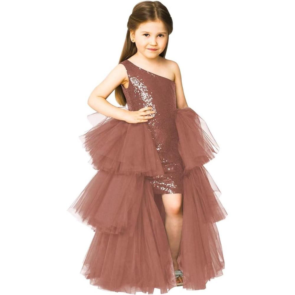 One Shoulder Sequin Pagent Dresses Girls Tulle Ball Gown Layered High Low Flower Girl Dress for Wedding(Dusty Rose)