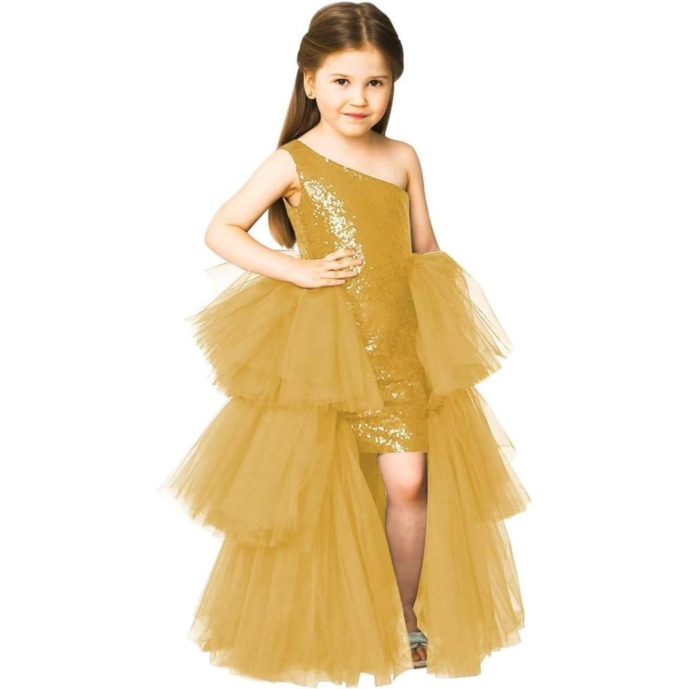 One Shoulder Sequin Pagent Dresses Girls Tulle Ball Gown Layered High Low Flower Girl Dress for Wedding(Gold)