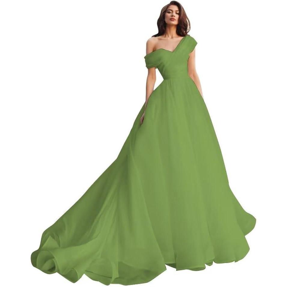 One Shoulder Tulle Prom Dresses Long Quinceanera Dress Ball Gown Organza Puffy Wedding Dresses for Bride(Olive)