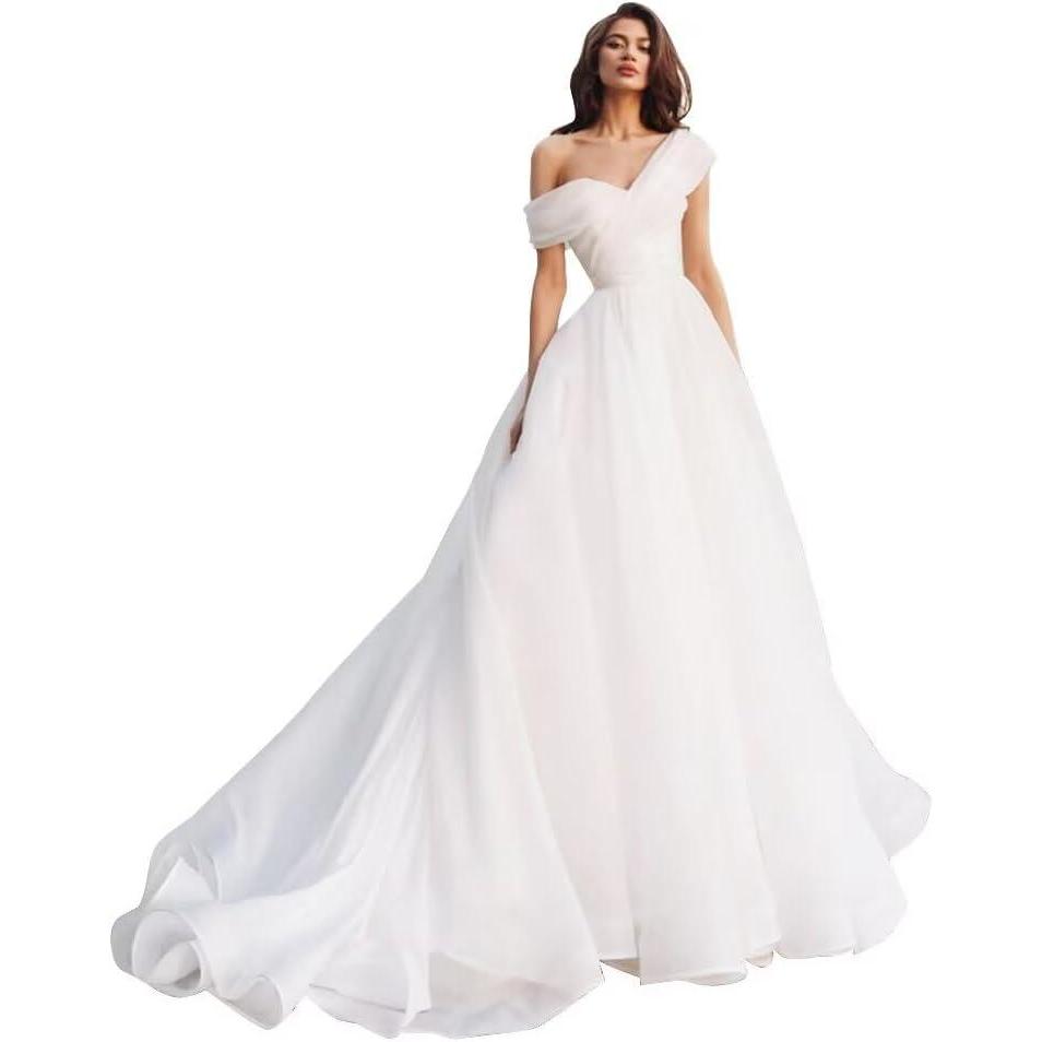 One Shoulder Tulle Prom Dresses Long Quinceanera Dress Ball Gown Organza Puffy Wedding Dresses for Bride(White)