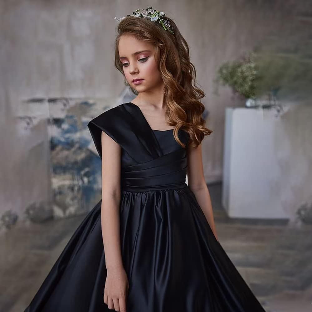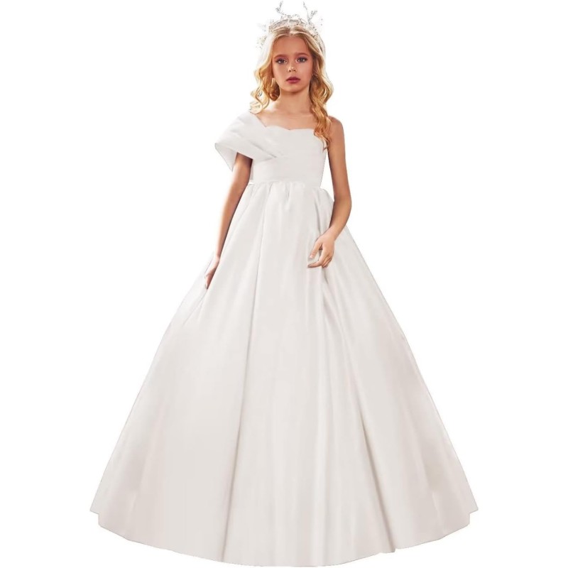 Satin One Shoulder Flower Girl Dresses for Wedding Ball Gown Puffy Pageant Gown Cute First Communion Dress(White)