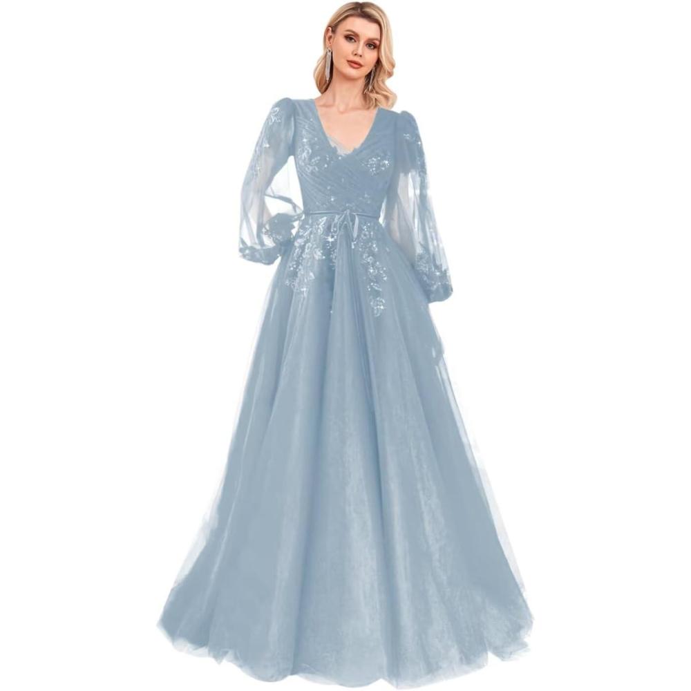 Sequin Applique Long Sleeve Prom Dress Sparkly Tulle Ball Gown A Line V Neck Formal Evening Gowns(Dusty Blue)