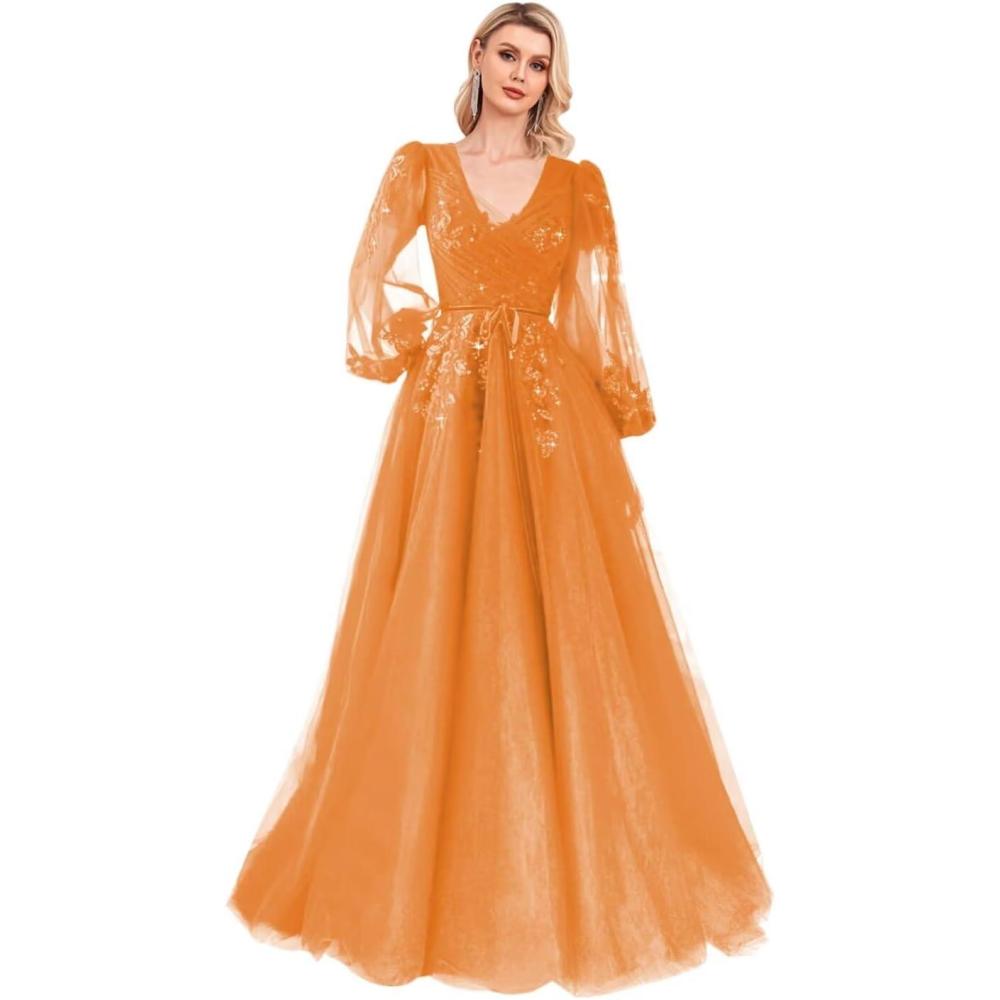 Sequin Applique Long Sleeve Prom Dress Sparkly Tulle Ball Gown A Line V Neck Formal Evening Gowns(Orange)