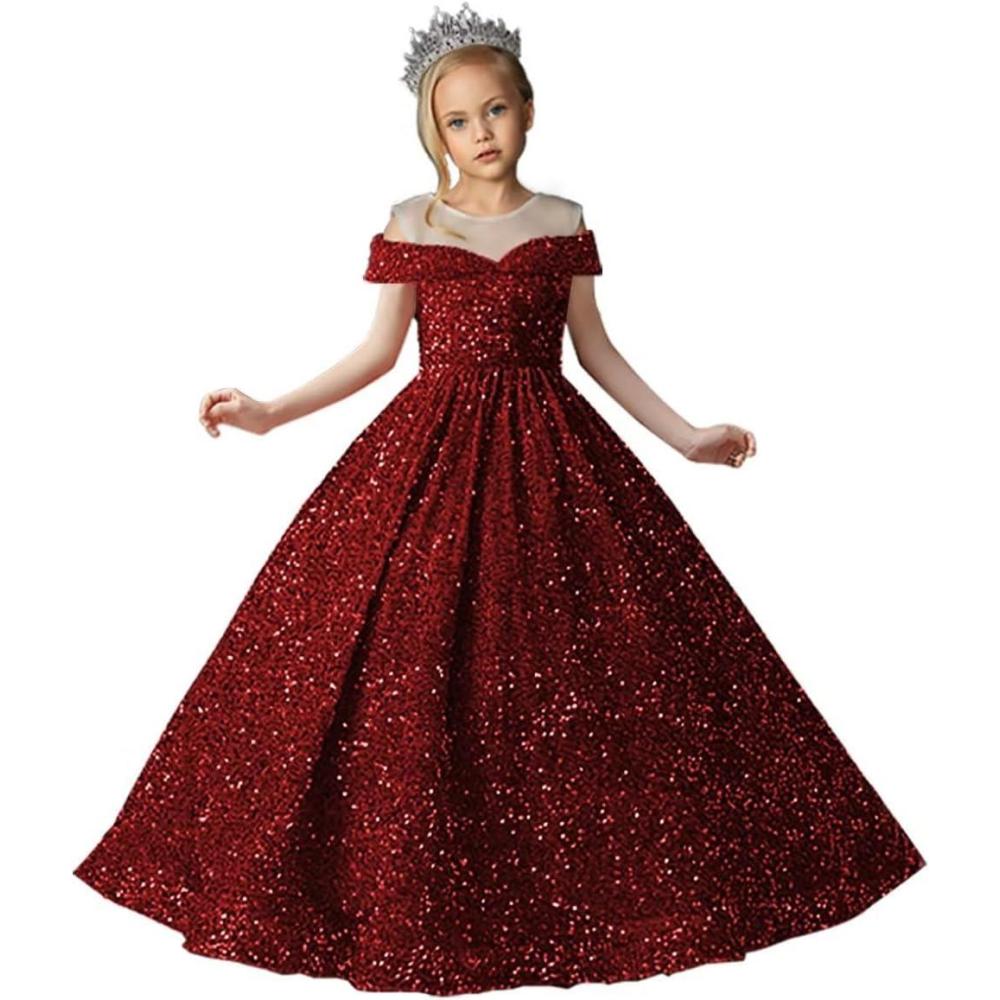 Sequin Flower Girl Dresses for Wedding Off Shoulder Sparkly Pageant Dress for Girls Ball Gown Kids Dress(Wine Red)