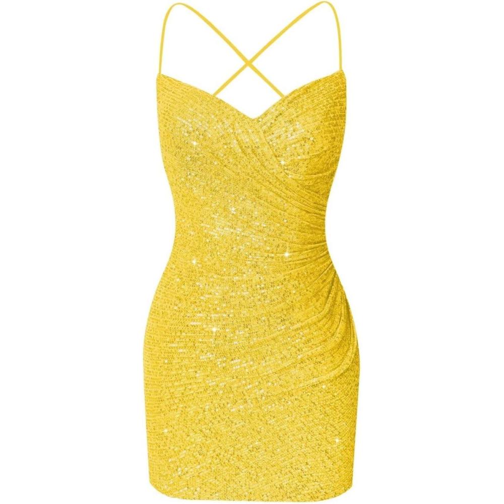 Sequin Tight Homecoming Dresses Short Spaghetti Straps Mermaid Prom Dress for Teens Cocktail Sparkly Mini Dress(Yellow)