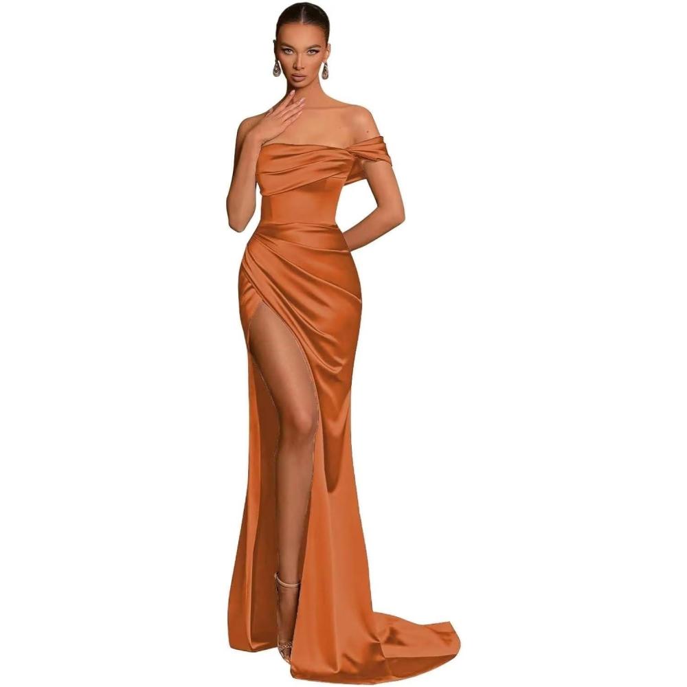 Silk Satin Bridesmaid Dresses One Shoulder Mermaid Prom Dress Ruched Formal Party Dress with Slit(Burnt Orange)
