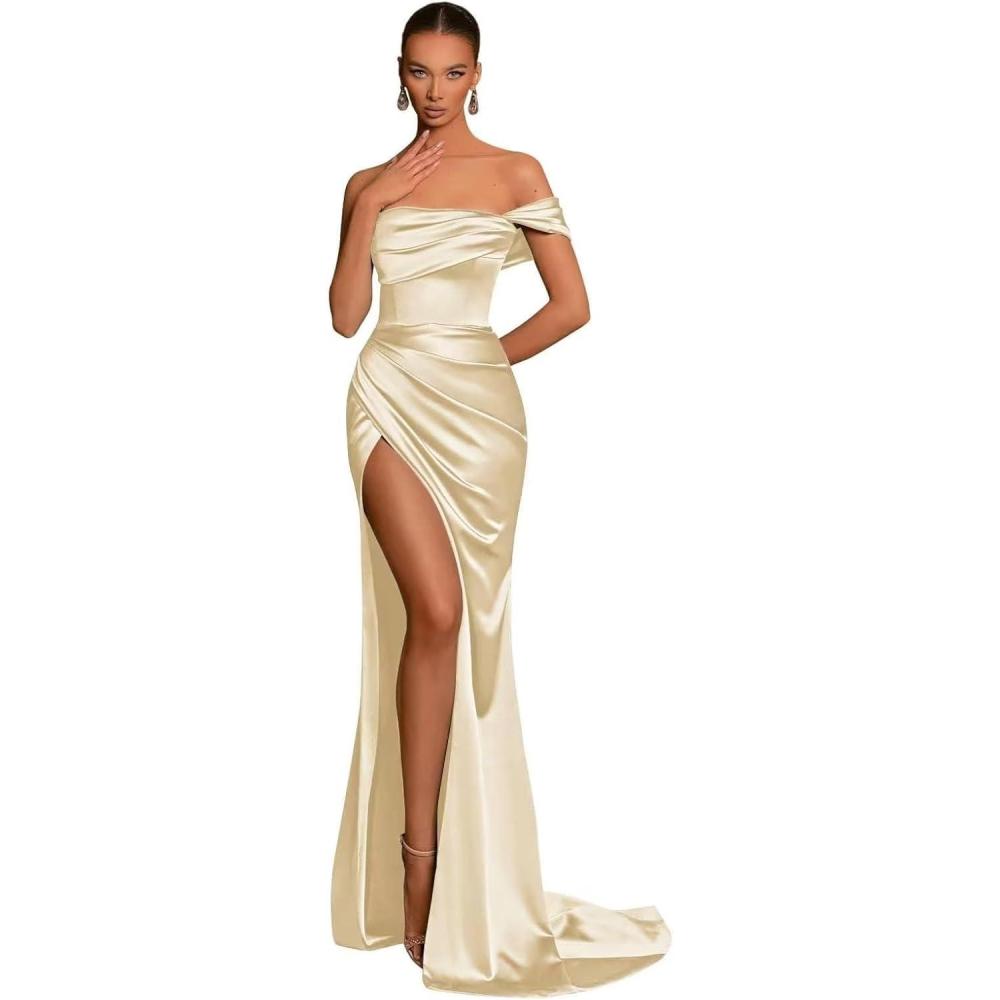 Silk Satin Bridesmaid Dresses One Shoulder Mermaid Prom Dress Ruched Formal Party Dress with Slit(Champagne)