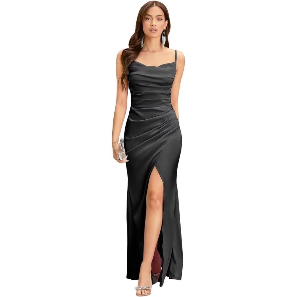 Spaghetti Straps Mermaid Prom Dress Long Silk Satin Bridesmaid Dresses for Wedding Cowl Neck Formal Gowns with Slit(Black)