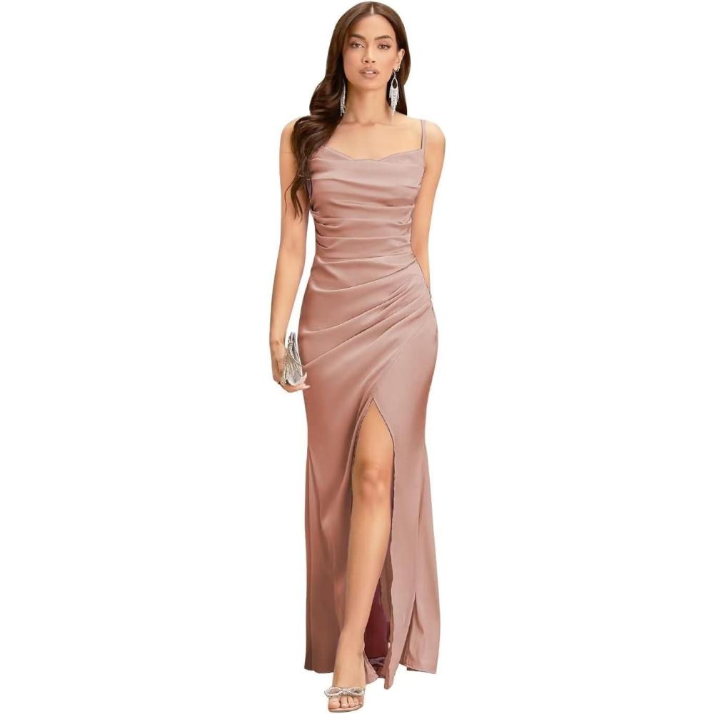 Spaghetti Straps Mermaid Prom Dress Long Silk Satin Bridesmaid Dresses for Wedding Cowl Neck Formal Gowns with Slit(Dusty Rose)