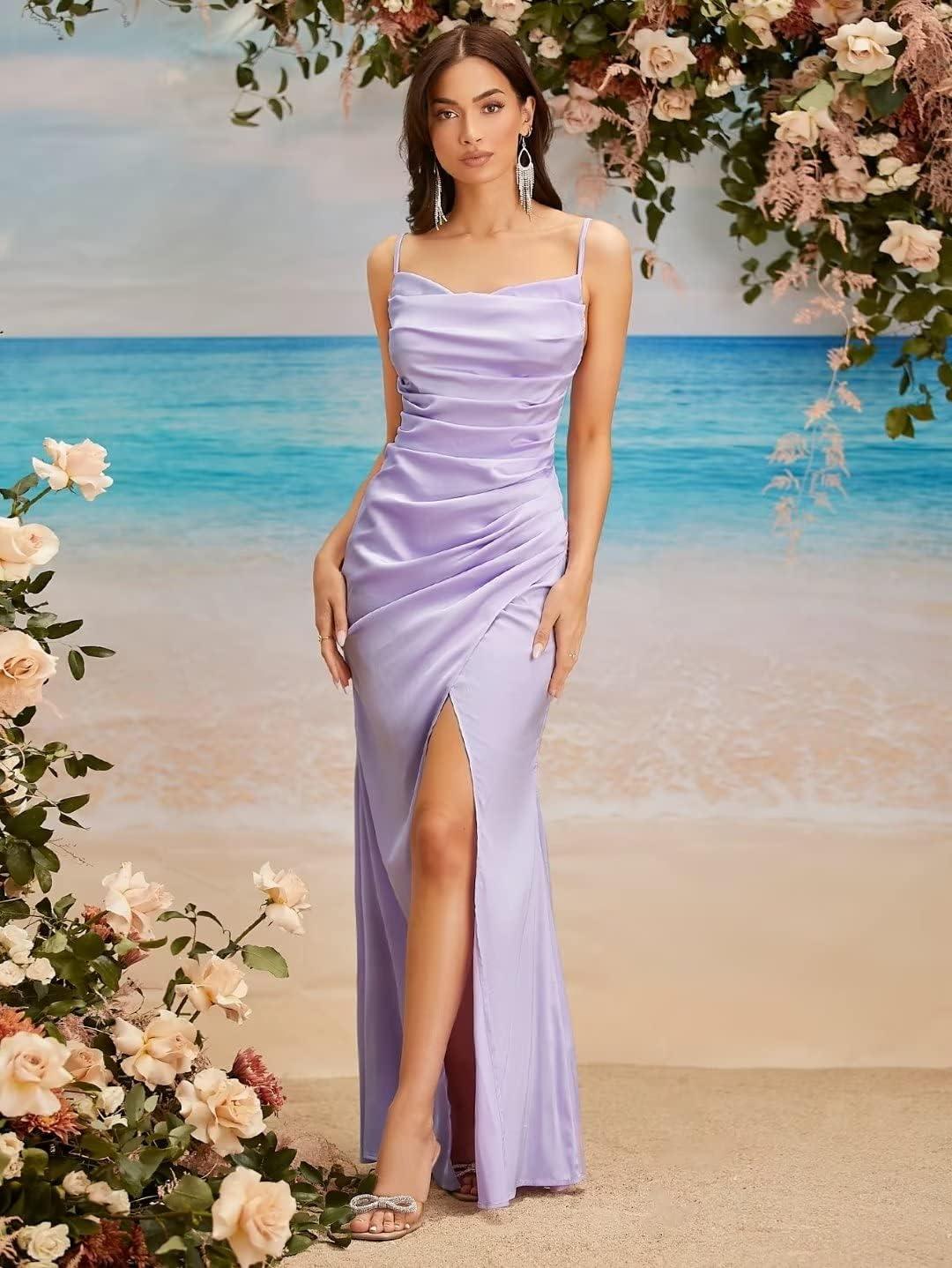 Spaghetti Straps Mermaid Prom Dress Long Silk Satin Bridesmaid Dresses for Wedding Cowl Neck Formal Gowns with Slit(Grape)