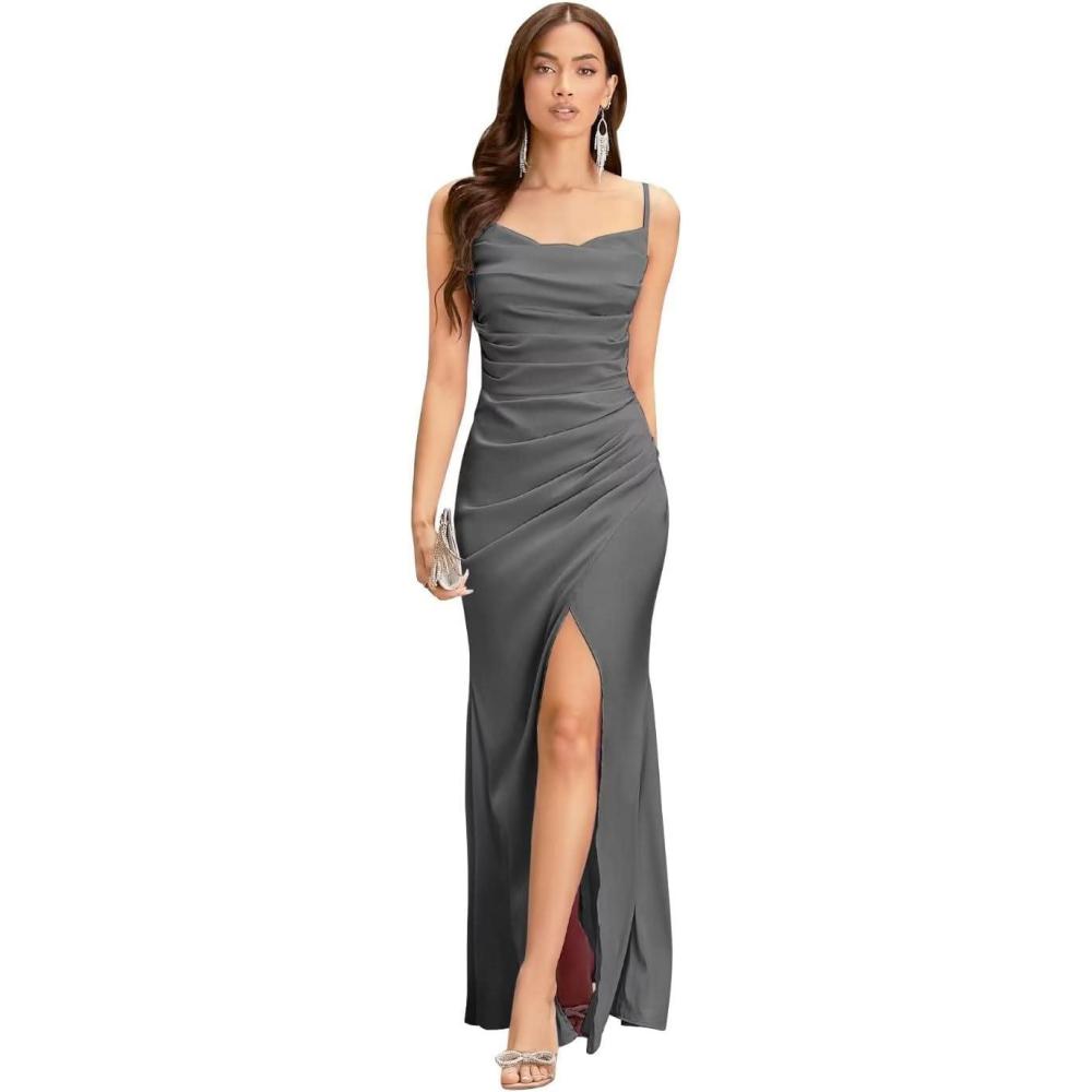 Spaghetti Straps Mermaid Prom Dress Long Silk Satin Bridesmaid Dresses for Wedding Cowl Neck Formal Gowns with Slit(Grey)