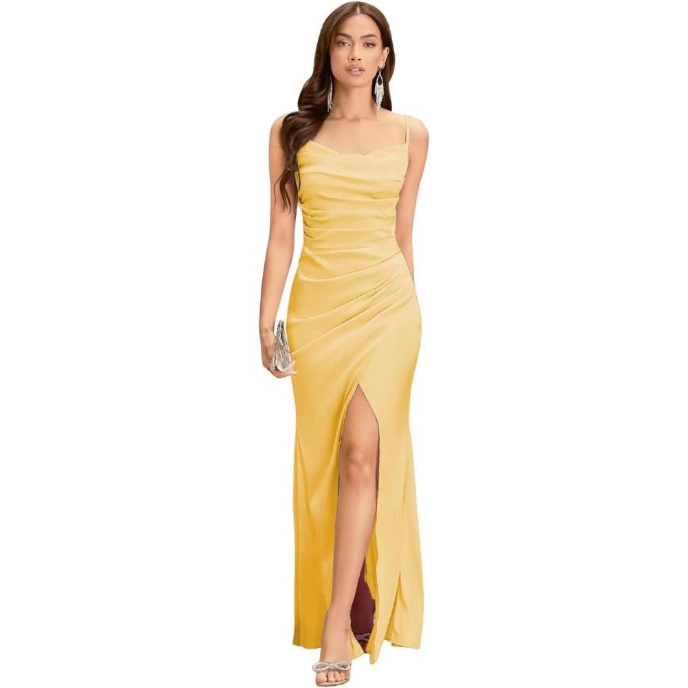 Spaghetti Straps Mermaid Prom Dress Long Silk Satin Bridesmaid Dresses for Wedding Cowl Neck Formal Gowns with Slit(Yellow)