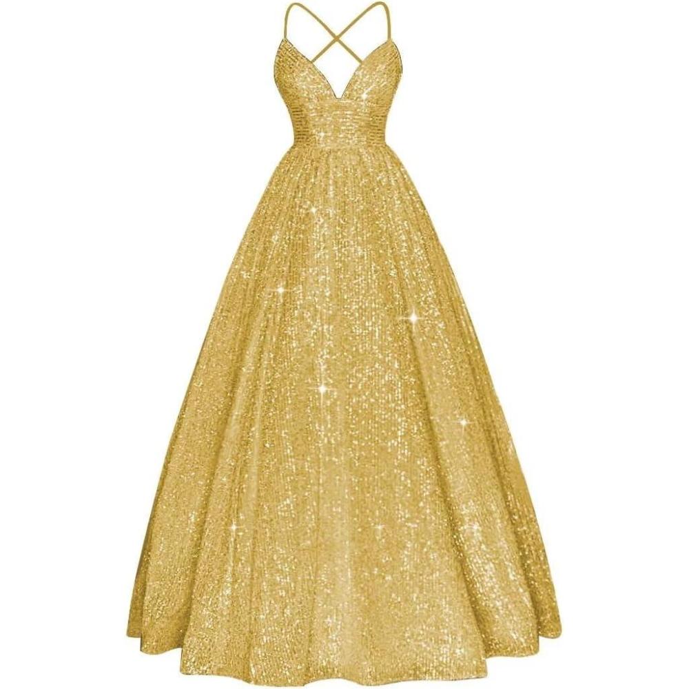 Spaghetti Straps Prom Dress Sequin Aline Evening Gown Sparkly Plus Size Ball Gown Wedding Formal Dresses(Gold)
