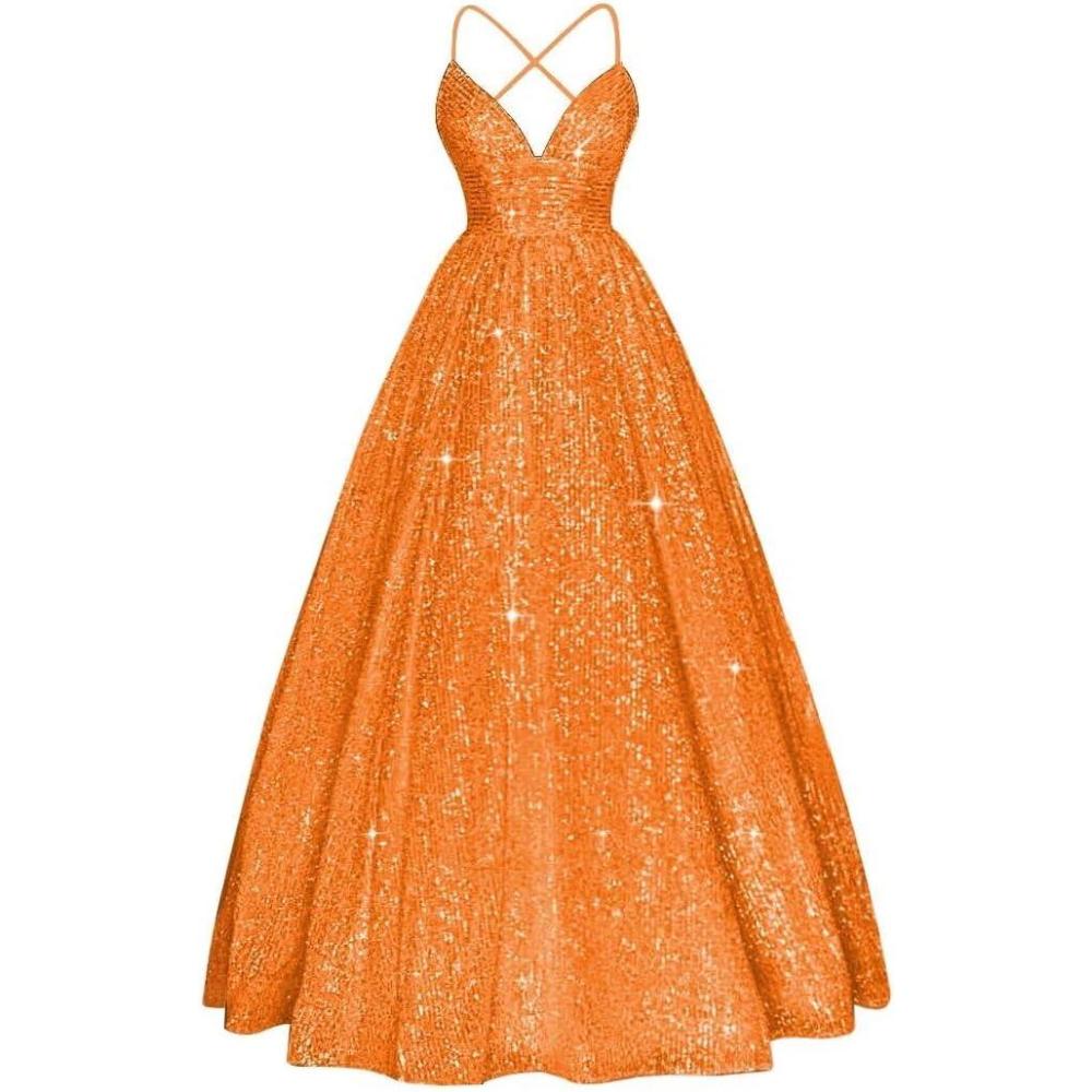 Spaghetti Straps Prom Dress Sequin Aline Evening Gown Sparkly Plus Size Ball Gown Wedding Formal Dresses(Orange)