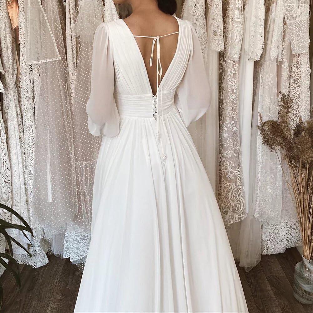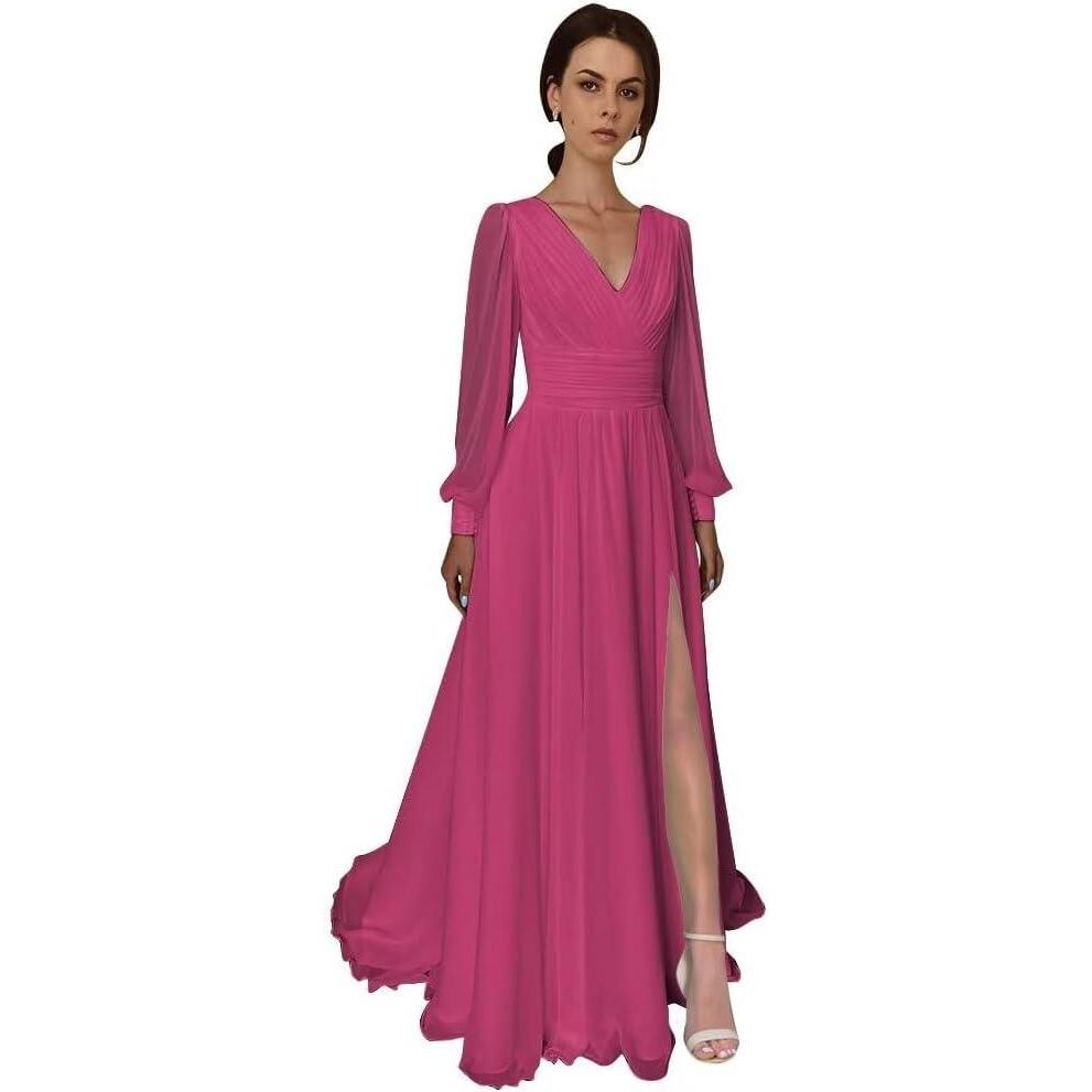 Split Chiffon V Neck Long Sleeve Prom Dresses for Women A-Line Pleated Formal Maxi Dress .