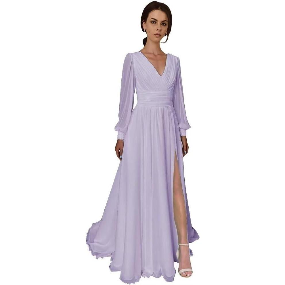 Split Chiffon V Neck Long Sleeve Prom Dresses Formal Dress for Women A-Line Pleated Maxi Gown(Lavender)
