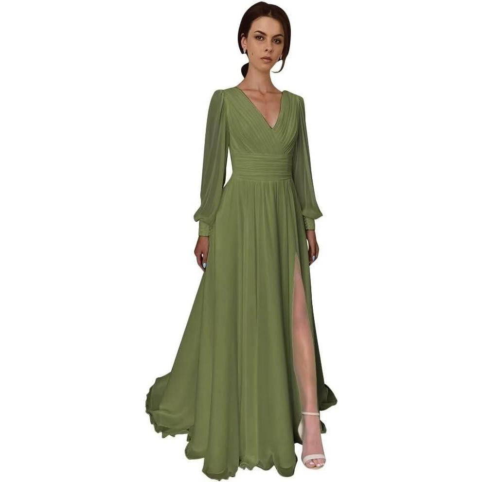 Don’t miss out on our limited-time offer: buy Split Chiffon V Neck Long Sleeve Prom Dresses Formal Dress for Women A-Line Pleated Maxi Gown(Olive), get {accessory} 50% off!