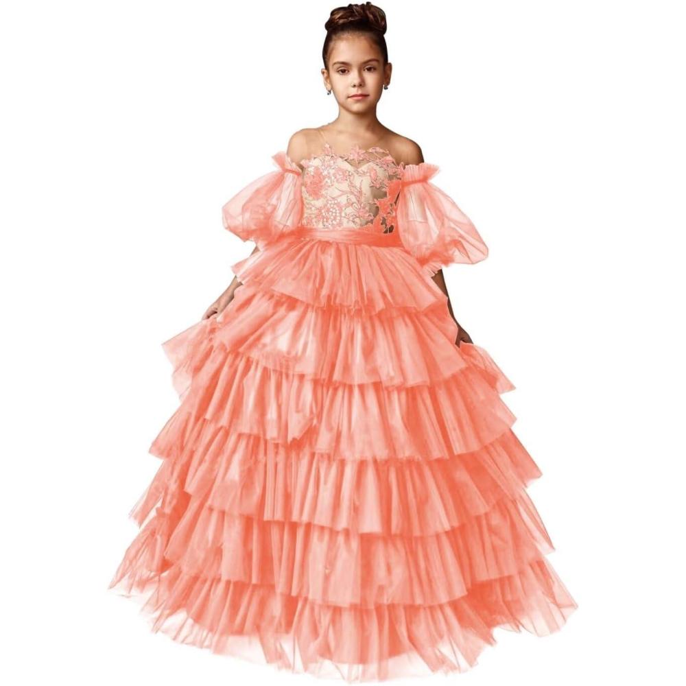 Tulle Pageant Dress Lace Flower Girl Dresses Appliques Tiered Princess Ball Gown Kids Prom Formal Gowns(Coral)