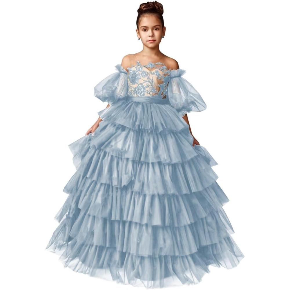 Tulle Pageant Dress Lace Flower Girl Dresses Appliques Tiered Princess Ball Gown Kids Prom Formal Gowns(Dusty Blue)