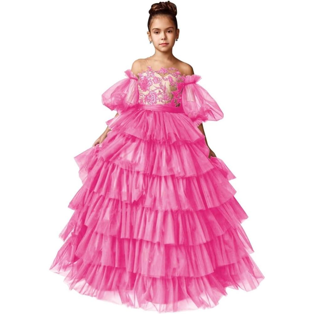 Tulle Pageant Dress Lace Flower Girl Dresses Appliques Tiered Princess Ball Gown Kids Prom Formal Gowns(Hot Pink)