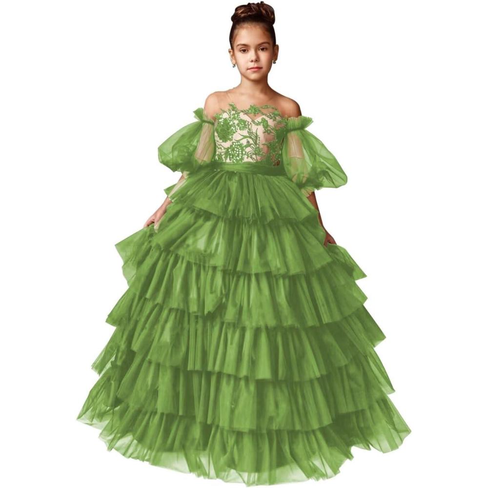 Tulle Pageant Dress Lace Flower Girl Dresses Appliques Tiered Princess Ball Gown Kids Prom Formal Gowns(Olive)