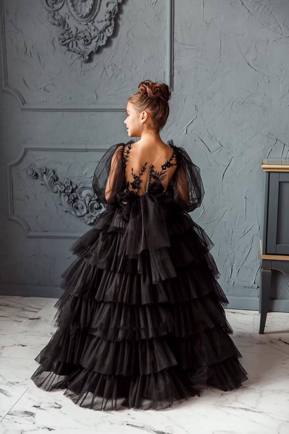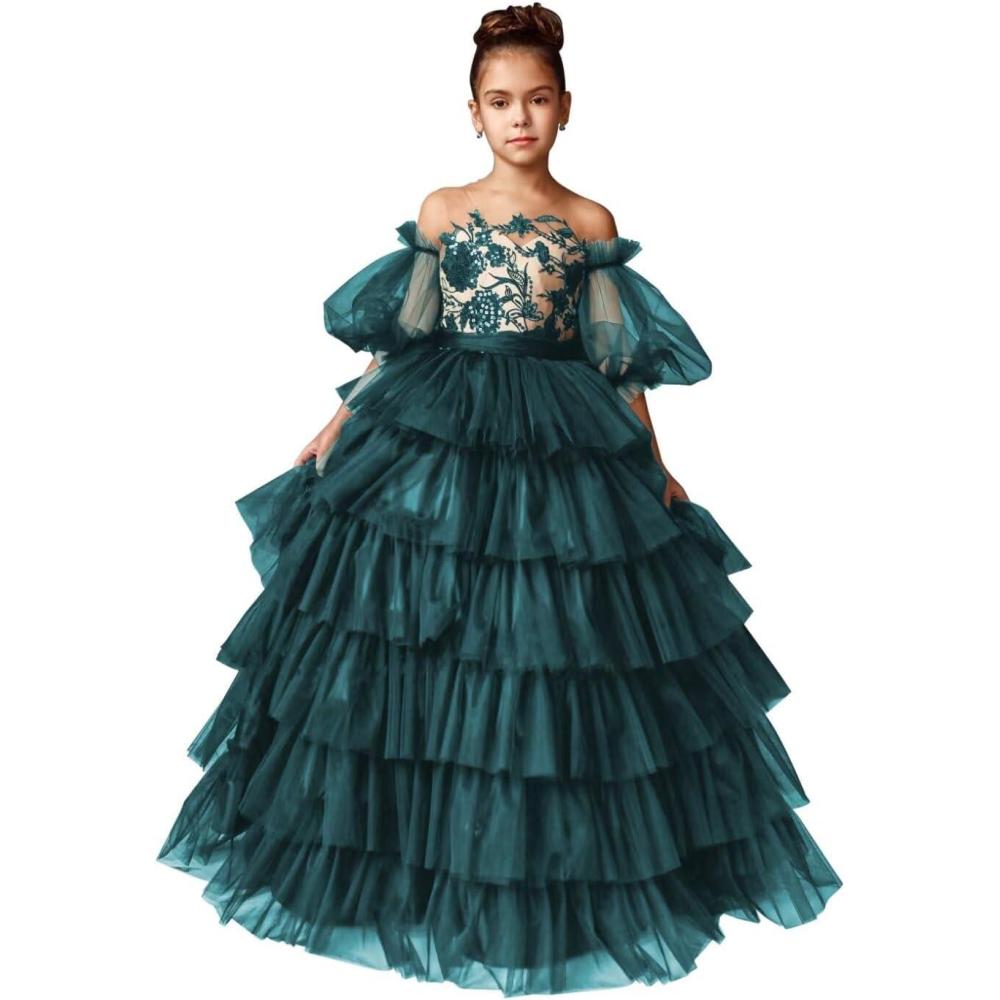 Tulle Pageant Dress Lace Flower Girl Dresses Appliques Tiered Princess Ball Gown Kids Prom Formal Gowns(Peacock)