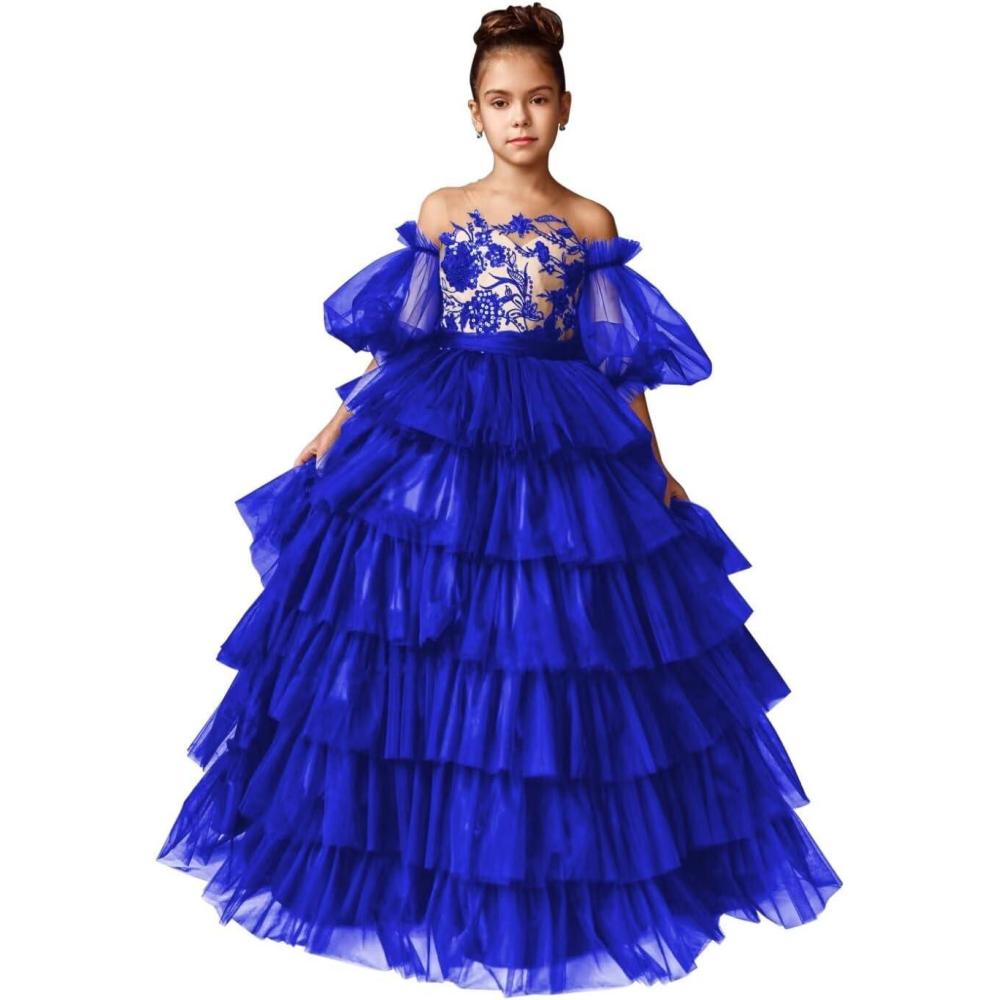 Tulle Pageant Dress Lace Flower Girl Dresses Appliques Tiered Princess Ball Gown Kids Prom Formal Gowns(Royal Blue)