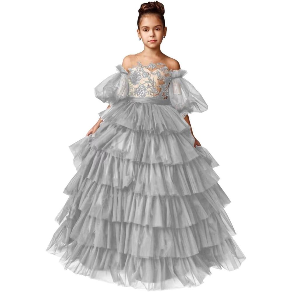 Tulle Pageant Dress Lace Flower Girl Dresses Appliques Tiered Princess Ball Gown Kids Prom Formal Gowns(Silver)