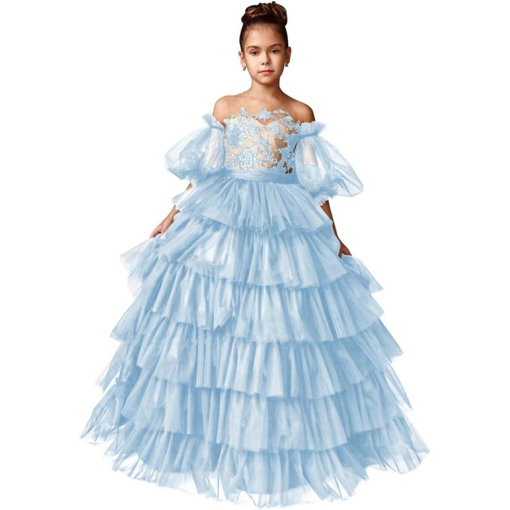 Tulle Pageant Dress Lace Flower Girl Dresses Appliques Tiered Princess Ball Gown Kids Prom Formal Gowns(Sky Blue)