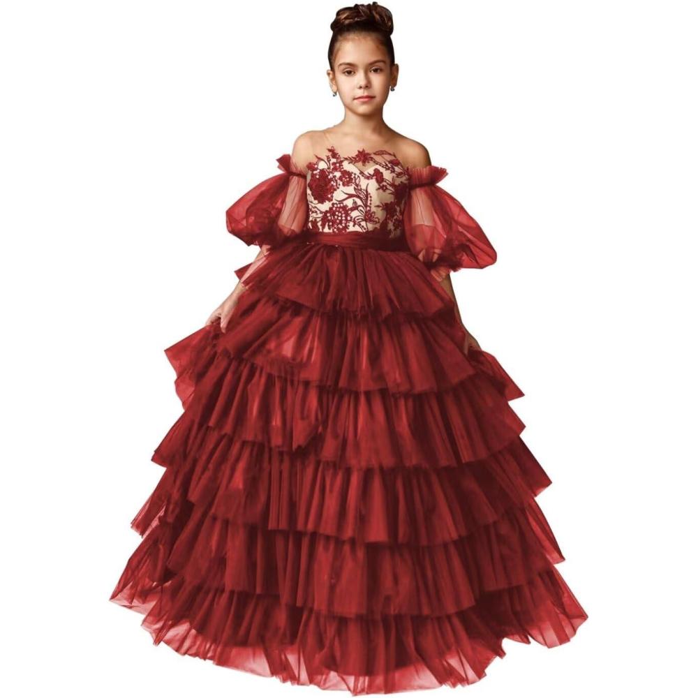 Tulle Pageant Dress Lace Flower Girl Dresses Appliques Tiered Princess Ball Gown Kids Prom Formal Gowns(Wine Red)