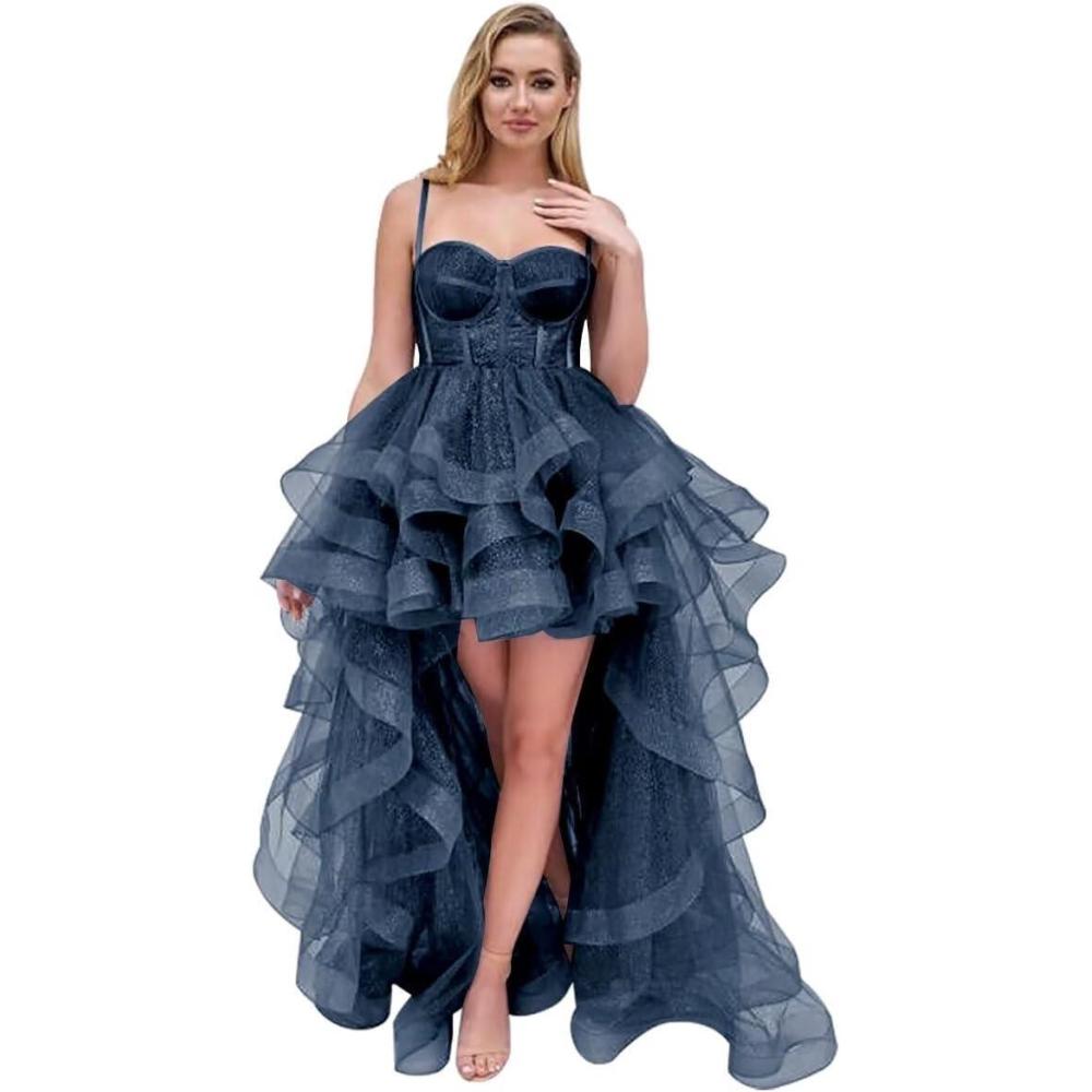 Tulle Prom Dress Spaghetti Straps Ball Gowns High Low Homecoming Dress Layered Ruffles Princess Quinceanera Dresses(Navy Blue)