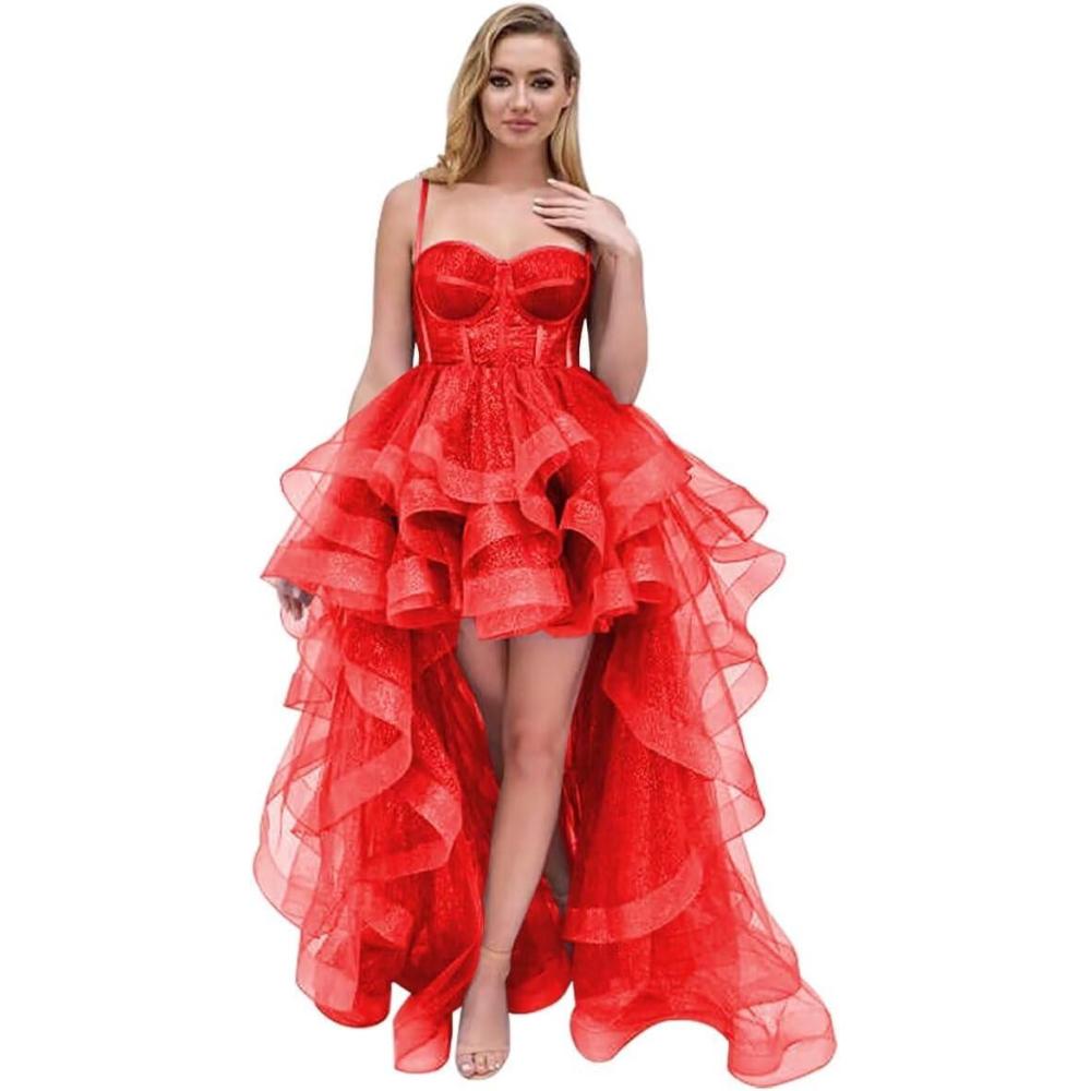 Tulle Prom Dress Spaghetti Straps Ball Gowns High Low Homecoming Dress Layered Ruffles Princess Quinceanera Dresses(Red)