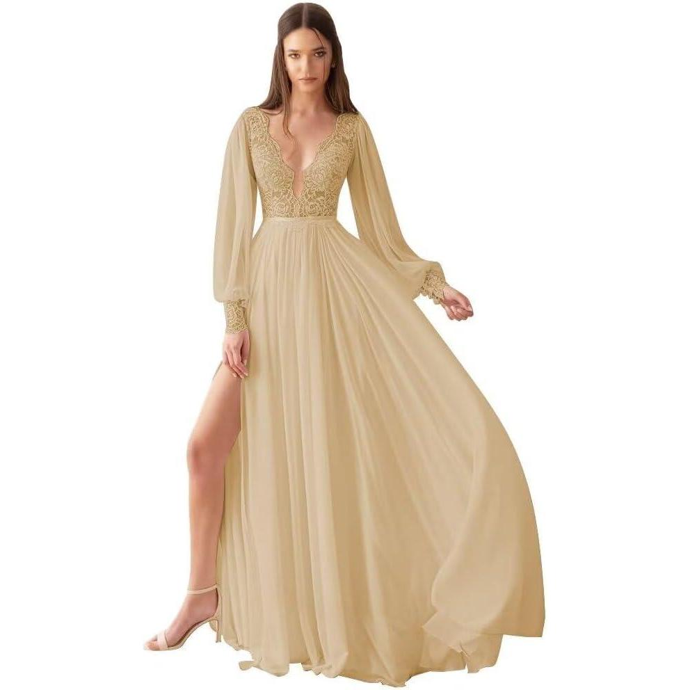 V Neck Long Sleeve Bridesmaid Dresses Lace Beach Boho Wedding Dress Chiffon Formal Gowns for Women with Slit(Champage)
