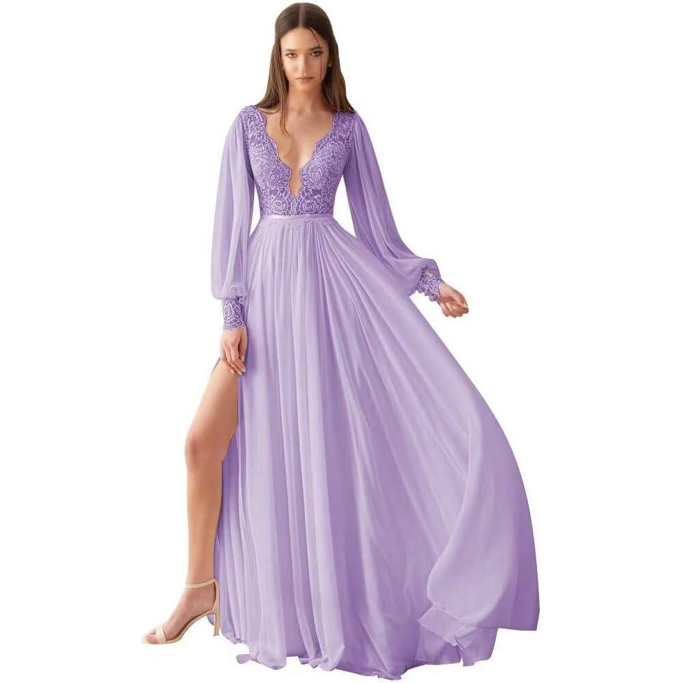 V Neck Long Sleeve Bridesmaid Dresses Lace Beach Boho Wedding Dress Chiffon Formal Gowns for Women with Slit(Lavender)