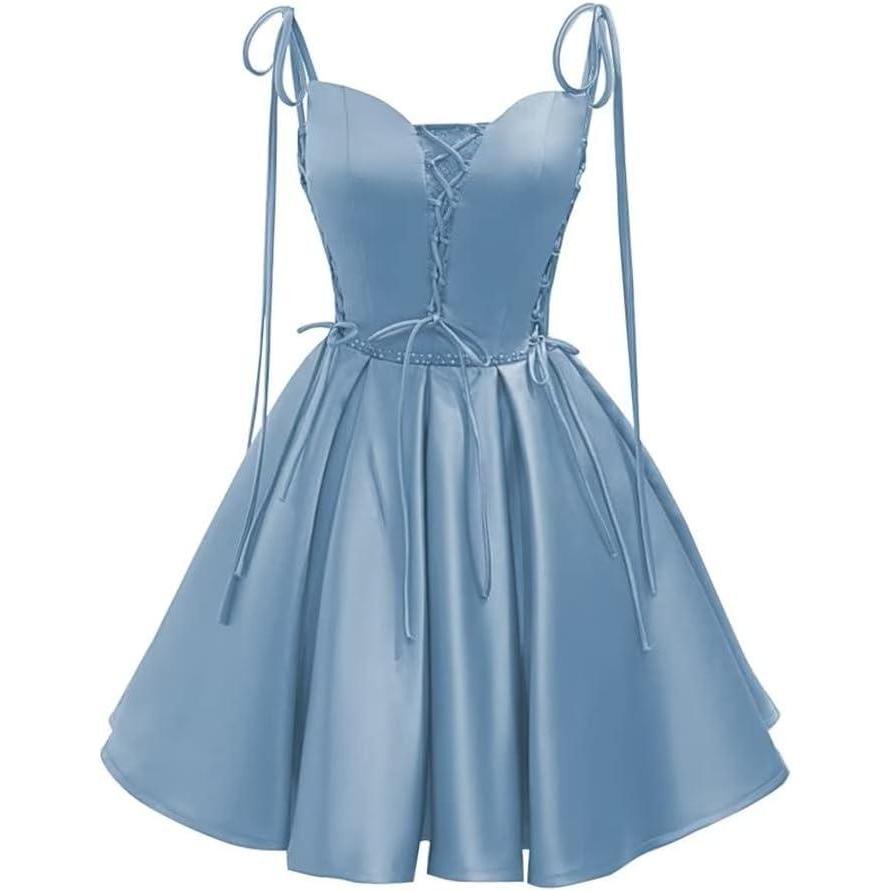 Vintage Gothic Dresses Satin Homecoming Dress Short Prom Dress for Teens Spaghetti Straps Cocktail Gowns(Dusty Blue)