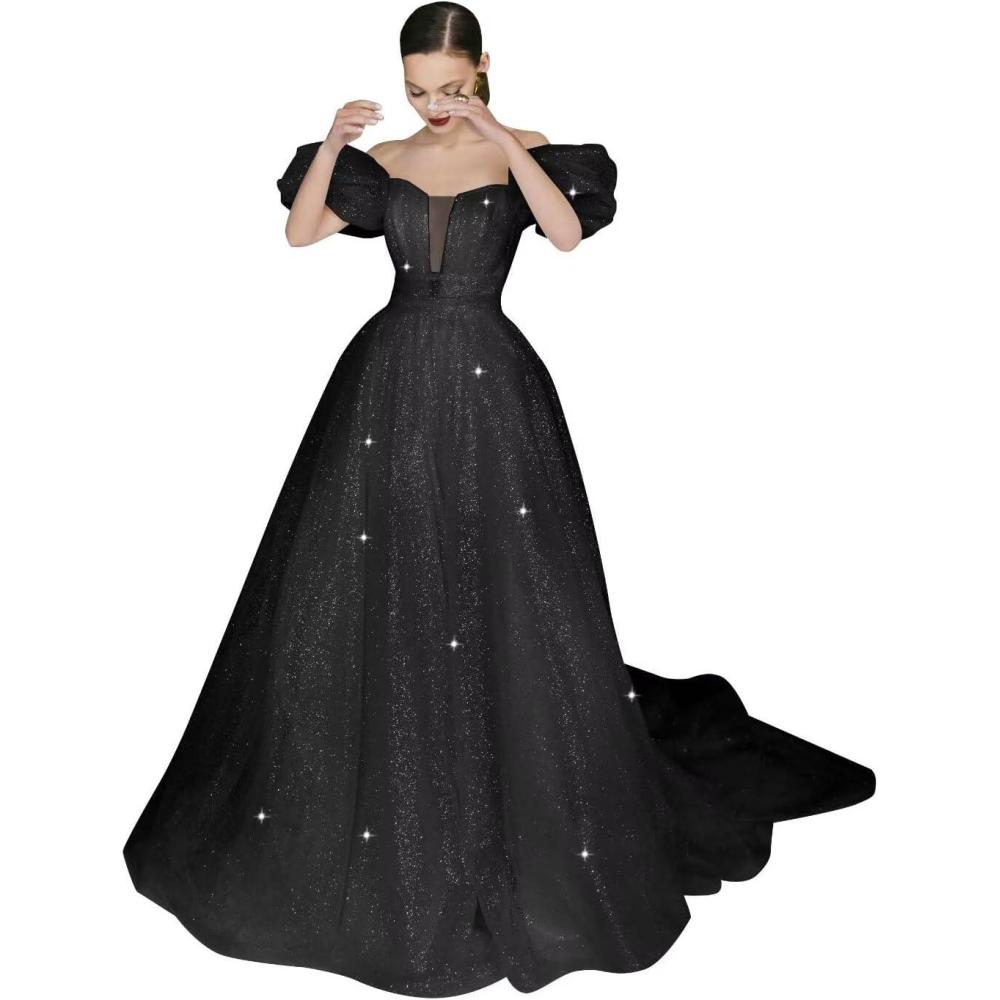 Women’s Puffy Sleeve Prom Dresses Long Ball Gown Glitter Tulle Wedding Dresses for Bride V Neck A Line Princess Gown(Black)