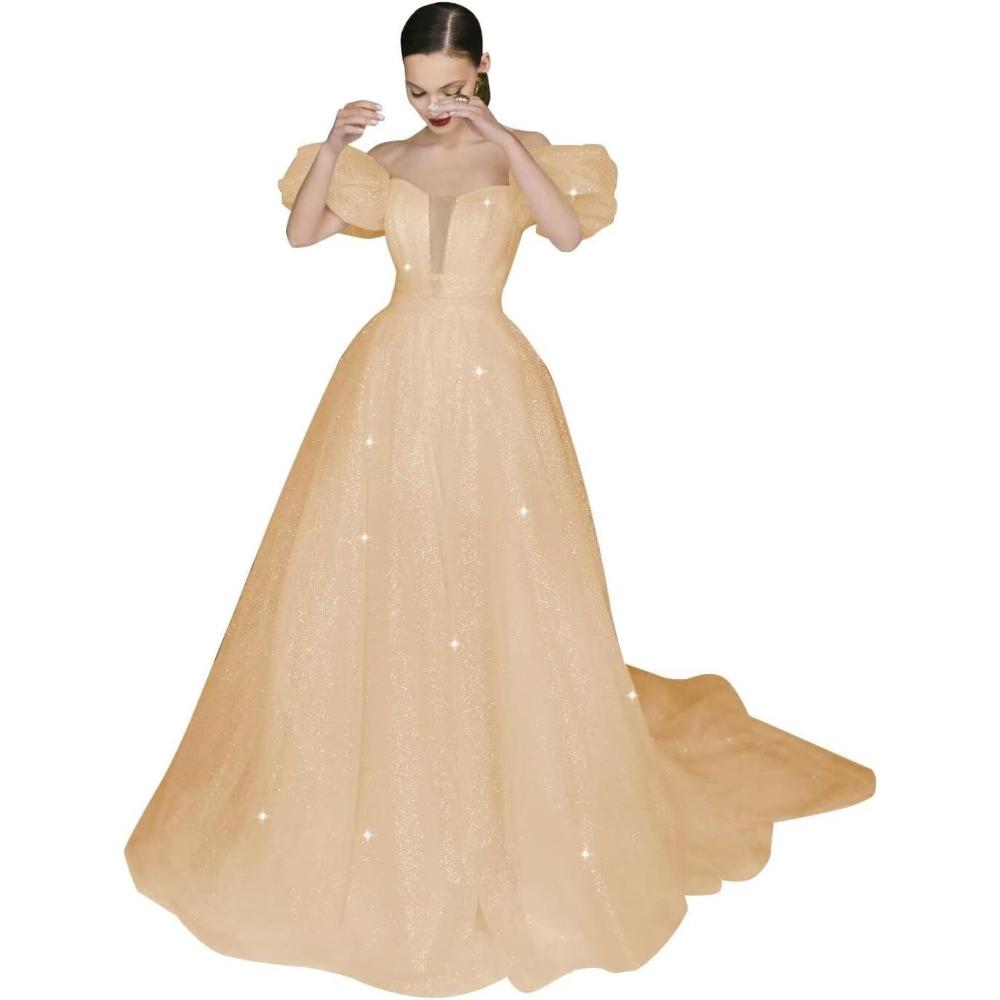 Women’s Puffy Sleeve Prom Dresses Long Ball Gown Glitter Tulle Wedding Dresses for Bride V Neck A Line Princess Gown(Champagne)