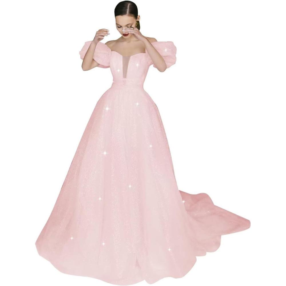 Women’s Puffy Sleeve Prom Dresses Long Ball Gown Glitter Tulle Wedding Dresses for Bride V Neck A Line Princess Gown(Pink)