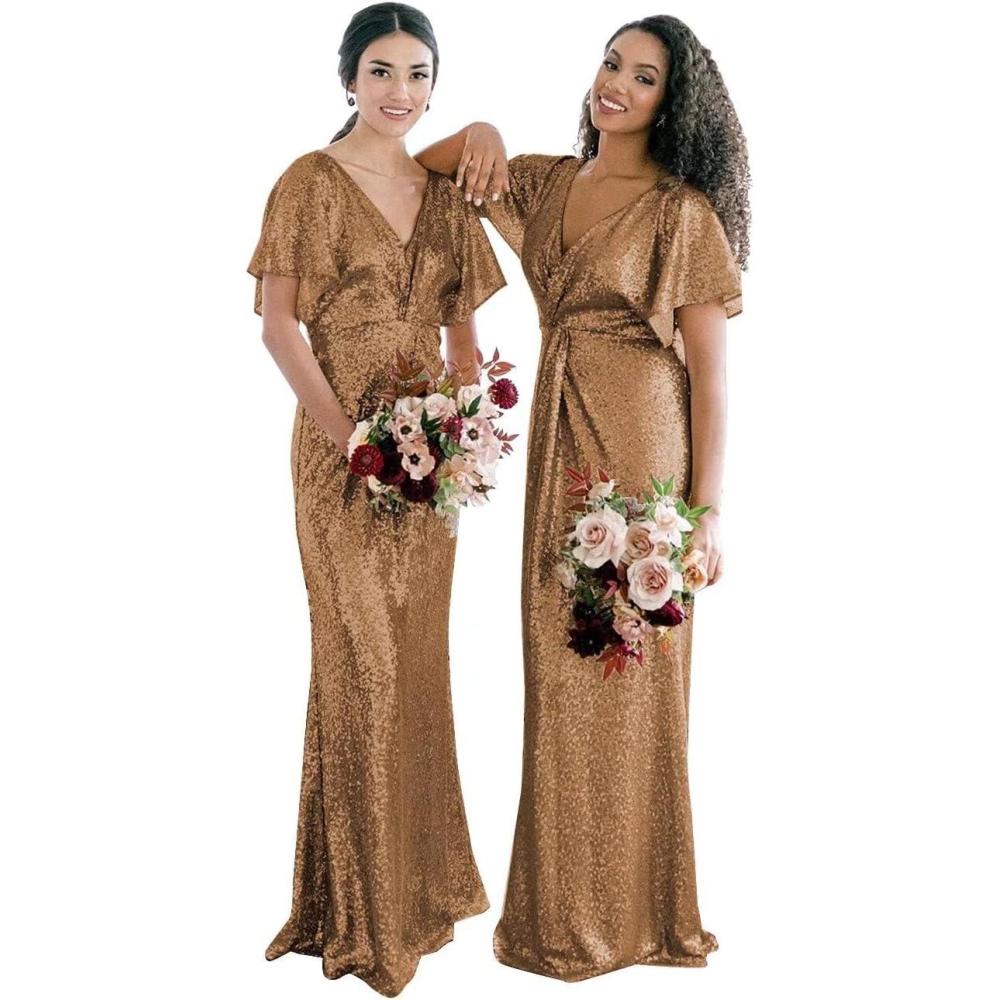 Women’s V Neck Sequin Bridesmaid Dresses Long Sparkly Prom Dresses 2024 Mermaid Wrap Formal Evening Gowns(Gold)
