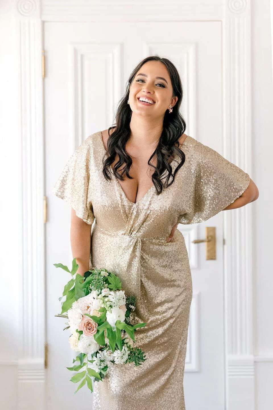 Women’s V Neck Sequin Bridesmaid Dresses Long Sparkly Prom Dresses 2024 Mermaid Wrap Formal Evening Gowns(Champagne Gold)